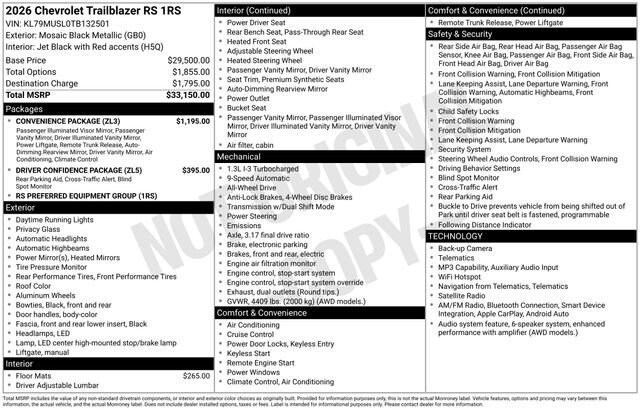 MPG Range: 26/29 mpg, Engine: 1.3L ECOTEC Turbo engine, Transmission: Automatic, Drive Line: AWD, Exterior Color: Mosaic Black Metallic, VIN: KL79MUSL0TB132501, Interior Color: Jet Black with Red accents, Evotex seat trim,Stock #: 26-2527