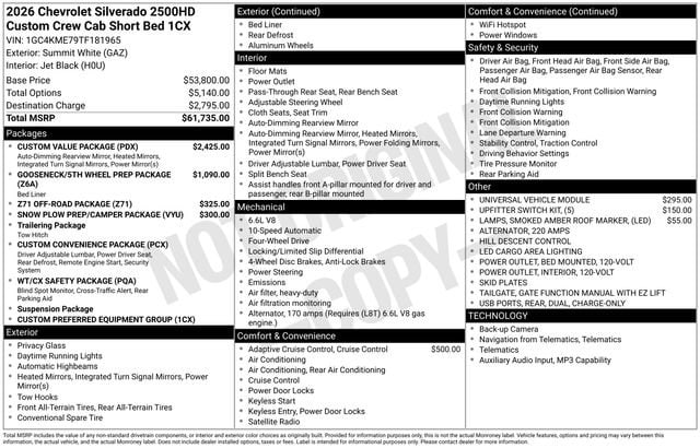 Engine: 6.6L V8 Gas engine, Transmission: Automatic, Drive Line: 4WD, Exterior Color: Summit White, VIN: 1GC4KME79TF181965, Interior Color: Jet Black, Cloth seat trim,Stock #: 26-1710