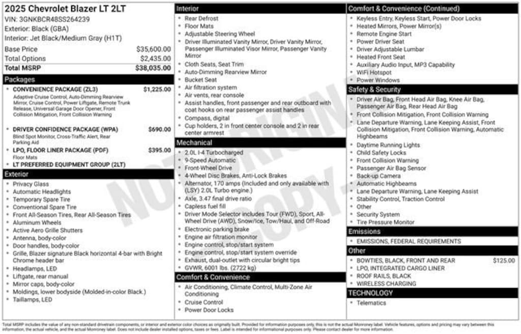170 Amp Alternator, 1st & 2nd Row All-Weather Floor Liners (LPO), 3.47 Final Drive Axle Ratio, 4-Way Manual Front Passenger Seat Adjuster, 4-Wheel Disc Brakes, 6 Speakers, 6-Speaker Audio System Feature, 8-Way Power Driver Seat Adjuster, ABS brakes, Adaptive Cruise Control, Air Conditioning, Alloy wheels, AM/FM radio: SiriusXM with 360L, Apple CarPlay/Android Auto, Auto High-beam Headlights, Automatic temperature control, Black Roof-Mounted Side Rails, Brake assist, Bumpers: body-color, Child-Seat-Sensing Airbag, Compass, Convenience Package, Delay-off headlights, Driver Confidence Package, Driver door bin, Driver vanity mirror, Dual front impact airbags, Dual front side impact airbags, Electronic Stability Control, Emergency communication system: OnStar and Chevrolet connected services capable, Enhanced Automatic Emergency Braking, Floor Liner Package (LPO), Four wheel independent suspension, Front & Rear Black Bowties, Front anti-roll bar, Front Bucket Seats, Front Center Armrest, Front dual zone A/C, Front reading lights, Fully automatic headlights, Heated door mirrors, Heated Driver & Front Passenger Seats, Heated front seats, Illuminated entry, Inside Rear-View Auto-Dimming Mirror, Integrated Cargo Liner (LPO), Knee airbag, Lane Change Alert w/Side Blind Zone Alert, Leather Shift Knob, Low tire pressure warning, Occupant sensing airbag, Outside temperature display, Overhead airbag, Overhead console, Panic alarm, Passenger door bin, Passenger vanity mirror, Power door mirrors, Power Driver Lumbar Control, Power driver seat, Power steering, Power windows, Preferred Equipment Group 2LT, Premium audio system: Chevrolet Infotainment 3 Plus, Premium Cloth Seat Trim, Radio data system, Radio: Chevrolet Infotainment 3 Plus System, Rear anti-roll bar, Rear Cross Traffic Alert, Rear Park Assist w/Audible Warning, Rear Power Programmable Liftgate, Rear reading lights, Rear seat center armrest, Rear window defroster, Rear window wiper, Remote keyless entry, Ride & Handling Suspension, Security system, SiriusXM w/360L, Speed control, Speed-sensing steering, Split folding rear seat, Spoiler, Steering wheel mounted audio controls, Stop-Start Engine Control System, Tachometer, Telescoping steering wheel, Tilt steering wheel, Traction control, Trip computer, Universal Home Remote, Variably intermittent wipers, Voltmeter, Wheels: 18 Grazen Metallic Aluminum, Wireless Charging.
