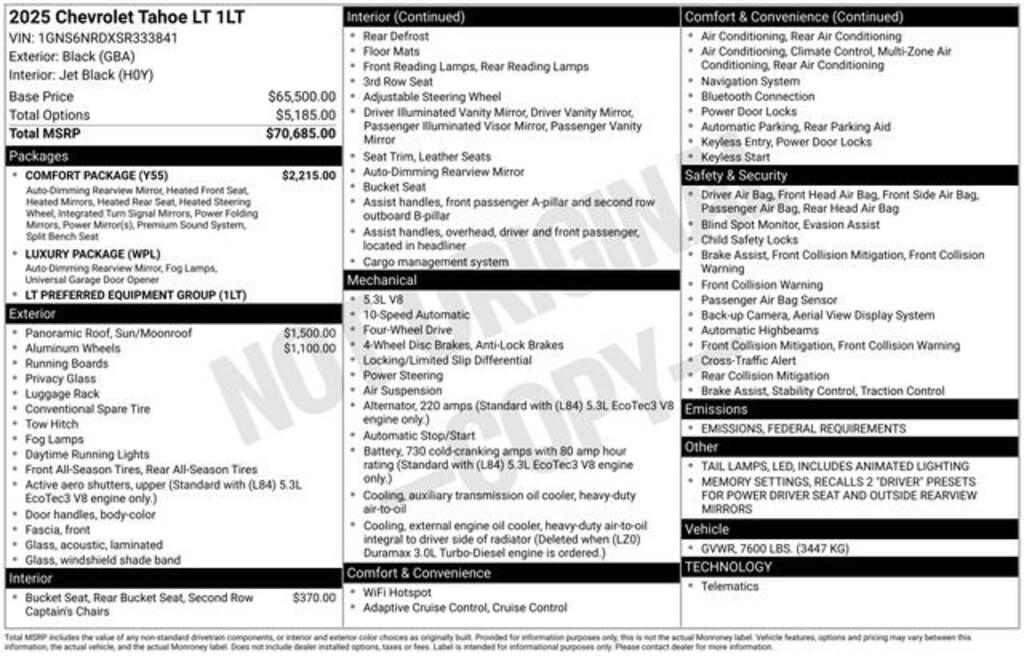 1st & 2nd Row Color-Keyed Carpeted Floor Mats, 2-Way Power Driver Lumbar Seat Adjuster, 2-Way Power Front Passenger Lumbar Seat Adjuster, 2nd Row Pwr Release 60/40 Split-Folding Bench Seat, 3-Spoke Wrapped Steering Wheel, 3.23 Rear Axle Ratio, 3rd Row 60/40 Power-Folding Split-Bench Seat, 3rd Row Manual 60/40 Split-Folding Bench Seats, 3rd row seats: split-bench, 4-Wheel Disc Brakes, 6 Speakers, 6-Speaker Audio System Feature, 8-Way Power Driver Seat Adjuster, 8-Way Power Front Passenger Seat Adjuster, ABS brakes, Air Conditioning, Alloy wheels, AM/FM radio: SiriusXM with 360L, Apple CarPlay/Android Auto, Auto High-beam Headlights, Auto-Dimming Inside Rear-View Mirror, Automatic temperature control, Bose 10-Speaker Centerpoint Surround Audio Sys Ft, Brake assist, Bumpers: body-color, Color-Keyed Carpeting Floor Covering, Comfort Package, Compass, Delay-off headlights, Driver door bin, Driver vanity mirror, Dual front impact airbags, Dual front side impact airbags, Dual-Pane Power Panoramic Sunroof, Electronic Stability Control, Emergency communication system: OnStar and Chevrolet connected services capable, Exterior Parking Camera Rear, Floor Console w/Storage Area, Four wheel independent suspension, Front anti-roll bar, Front Bucket Seats, Front Center Armrest, Front dual zone A/C, Front LED Fog Lamps, Front Pedestrian & Bicyclist Braking, Front reading lights, Frontal Driver & Outboard Passenger Airbags, Fully automatic headlights, Heated 2nd Row Outboard Seats, Heated door mirrors, Heated Driver & Front Passenger Seats, Heated front seats, Heated Steering Wheel, Illuminated entry, Leather-Appointed Seat Trim, LED Headlamps w/LED Daytime Running Lamps, LED Tail Lamps, Low tire pressure warning, Luxury Package, Memory seat, Memory Settings, Memory Settings for Driver, Navigation system: Google built-in compatibility (select service plan required, terms and limitations apply), Occupant sensing airbag, Outside Heated Power-Adjustable Mirrors, Outside temperature display, Overhead airbag, Overhead console, Panic alarm, Passenger door bin, Passenger vanity mirror, Power door mirrors, Power driver seat, Power Liftgate, Power passenger seat, Power Release 2nd Row Bucket Seats, Power steering, Power windows, Preferred Equipment Group 1LT, Premium audio system: Chevrolet Infotainment 3 Premium, Premium Smooth Ride Suspension, Radio data system, Radio: 17.7 Diagonal Advanced Color LCD Display, Rain sensing wipers, Rear air conditioning, Rear anti-roll bar, Rear Power Liftgate, Rear reading lights, Rear seat center armrest, Rear window defroster, Rear window wiper, Remote keyless entry, Remote Start, Security system, SiriusXM w/360L Trial Subscription, Speed control, Speed-sensing steering, Split folding rear seat, Spoiler, Steering wheel mounted audio controls, Tachometer, Telescoping steering wheel, Tilt steering wheel, Traction control, Trip computer, Universal Home Remote, USB Ports, Variably intermittent wipers, Voltmeter, Wheels: 18 x 8.5 Bright Silver Painted Aluminum, Wheels: 20 x 9 Machined Aluminum, Wireless Phone Charging.
