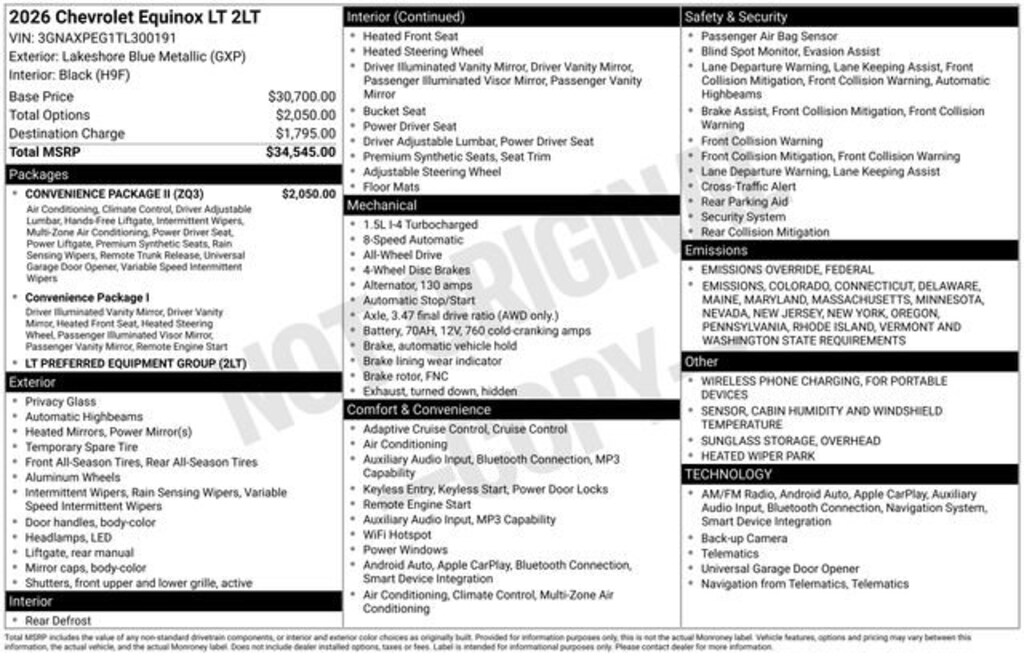 2-Way Power Driver Lumbar Control Seat Adjuster, 3.47 Final Drive Axle Ratio, 4-Wheel Disc Brakes, 6 Speakers, ABS brakes, Air Conditioning, Alloy wheels, AM/FM radio: SiriusXM, Auto High-beam Headlights, AutoSense Hands-Free Power Programmable Liftgate, Brake assist, Bumpers: body-color, Cabin Humidity & Windshield Sensor, Cloth Seat Trim, Compass, Convenience Package II, Delay-off headlights, Driver 6-Way Manual Seat Adjuster, Driver 8-Way Power Seat Adjuster, Driver door bin, Driver vanity mirror, Dual front impact airbags, Dual front side impact airbags, Dual-Zone Automatic Climate Control, Electronic Stability Control, Emergency communication system: OnStar and Chevrolet connected services capable, Evotex Seat Trim, Four wheel independent suspension, Front anti-roll bar, Front Bucket Seats, Front Center Armrest, Front Passenger 4-Way Manual Seat Adjuster, Front reading lights, Fully automatic headlights, Heated door mirrors, Heated Driver & Front Passenger Seats, Heated front seats, Heated steering wheel, Heated Wiper Park, Illuminated entry, Intermittent Front Rain-Sensing Wipers, Low tire pressure warning, Navigation System, Occupant sensing airbag, Outside temperature display, Overhead airbag, Overhead console, Overhead Sunglass Storage, Panic alarm, Passenger door bin, Passenger vanity mirror, Power door mirrors, Power steering, Power windows, Preferred Equipment Group 2LT, Premium audio system: Chevrolet Infotainment 3, Programmable Universal Home Remote, Radio data system, Radio: 11.3 Diagonal Advanced Color LCD Display, Rear anti-roll bar, Rear reading lights, Rear seat center armrest, Rear window defroster, Rear window wiper, Remote keyless entry, Security system, SiriusXM w/360L Trial Subscription, Speed control, Speed-sensing steering, Split folding rear seat, Spoiler, Steering wheel mounted audio controls, Tachometer, Telescoping steering wheel, Tilt steering wheel, Traction control, Trip computer, Variably intermittent wipers, Wheels: 17 Grazen Metallic Machined-Face Aluminum, Wireless Phone Charging for Portable Devices.