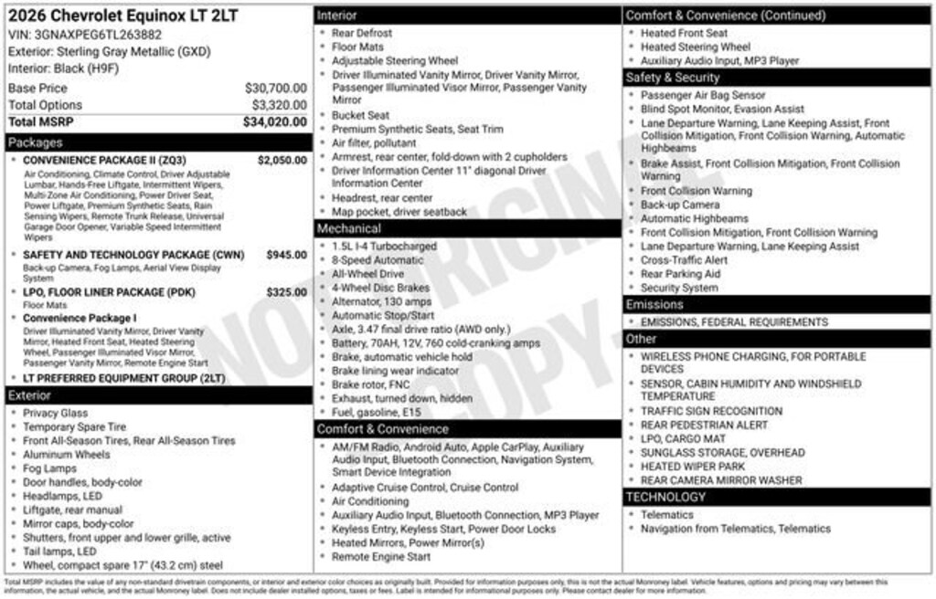 2-Way Power Driver Lumbar Control Seat Adjuster, 3.47 Final Drive Axle Ratio, 4-Wheel Disc Brakes, 6 Speakers, ABS brakes, Air Conditioning, All-Weather Floor Liners (LPO), Alloy wheels, AM/FM radio: SiriusXM, Auto High-beam Headlights, AutoSense Hands-Free Power Programmable Liftgate, Brake assist, Bumpers: body-color, Cabin Humidity & Windshield Sensor, Cargo Mat, Cloth Seat Trim, Compass, Convenience Package II, Delay-off headlights, Driver 6-Way Manual Seat Adjuster, Driver 8-Way Power Seat Adjuster, Driver door bin, Driver vanity mirror, Dual front impact airbags, Dual front side impact airbags, Dual-Zone Automatic Climate Control, Electronic Stability Control, Emergency communication system: OnStar and Chevrolet connected services capable, Evotex Seat Trim, Floor Liner Package (LPO), Four wheel independent suspension, Front anti-roll bar, Front Bucket Seats, Front Center Armrest, Front Fog Lamps, Front Passenger 4-Way Manual Seat Adjuster, Front reading lights, Fully automatic headlights, HD Surround Vision, Heated door mirrors, Heated Driver & Front Passenger Seats, Heated front seats, Heated steering wheel, Heated Wiper Park, Illuminated entry, Intermittent Front Rain-Sensing Wipers, Low tire pressure warning, Navigation System, Occupant sensing airbag, Outside temperature display, Overhead airbag, Overhead console, Overhead Sunglass Storage, Panic alarm, Passenger door bin, Passenger vanity mirror, Power door mirrors, Power steering, Power windows, Preferred Equipment Group 2LT, Premium audio system: Chevrolet Infotainment 3, Programmable Universal Home Remote, Radio data system, Radio: 11.3 Diagonal Advanced Color LCD Display, Rear anti-roll bar, Rear Camera Mirror Washer, Rear Pedestrian Alert, Rear reading lights, Rear seat center armrest, Rear window defroster, Rear window wiper, Remote keyless entry, Safety & Technology Package, Second Row All-Weather Mat (LPO), Security system, SiriusXM w/360L Trial Subscription, Speed control, Speed-sensing steering, Split folding rear seat, Spoiler, Steering wheel mounted audio controls, Tachometer, Telescoping steering wheel, Tilt steering wheel, Traction control, Traffic Sign Recognition, Trip computer, Variably intermittent wipers, Wheels: 17 Grazen Metallic Machined-Face Aluminum, Wireless Phone Charging for Portable Devices.