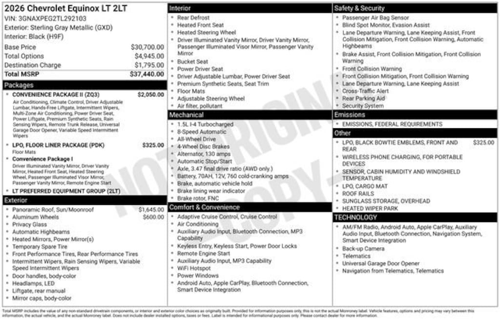 2-Way Power Driver Lumbar Control Seat Adjuster, 3.47 Final Drive Axle Ratio, 4-Wheel Disc Brakes, 6 Speakers, ABS brakes, Air Conditioning, All-Weather Floor Liners (LPO), Alloy wheels, AM/FM radio: SiriusXM, Auto High-beam Headlights, AutoSense Hands-Free Power Programmable Liftgate, Brake assist, Bumpers: body-color, Cabin Humidity & Windshield Sensor, Cargo Mat, Cloth Seat Trim, Compass, Convenience Package II, Delay-off headlights, Driver 6-Way Manual Seat Adjuster, Driver 8-Way Power Seat Adjuster, Driver door bin, Driver vanity mirror, Dual front impact airbags, Dual front side impact airbags, Dual-Zone Automatic Climate Control, Electronic Stability Control, Emergency communication system: OnStar and Chevrolet connected services capable, Evotex Seat Trim, Floor Liner Package (LPO), Four wheel independent suspension, Front & Rear Black Bowtie Emblems (LPO), Front anti-roll bar, Front Bucket Seats, Front Center Armrest, Front Passenger 4-Way Manual Seat Adjuster, Front reading lights, Fully automatic headlights, Heated door mirrors, Heated Driver & Front Passenger Seats, Heated front seats, Heated steering wheel, Heated Wiper Park, Illuminated entry, Intermittent Front Rain-Sensing Wipers, Low tire pressure warning, Navigation System, Occupant sensing airbag, Outside temperature display, Overhead airbag, Overhead console, Overhead Sunglass Storage, Panic alarm, Passenger door bin, Passenger vanity mirror, Power door mirrors, Power Dual Glass Panoramic Sliding Sunroof, Power steering, Power windows, Preferred Equipment Group 2LT, Premium audio system: Chevrolet Infotainment 3, Programmable Universal Home Remote, Radio data system, Radio: 11.3 Diagonal Advanced Color LCD Display, Rear anti-roll bar, Rear reading lights, Rear seat center armrest, Rear window defroster, Rear window wiper, Remote keyless entry, Roof Rails, Second Row All-Weather Mat (LPO), Security system, SiriusXM w/360L Trial Subscription, Speed control, Speed-sensing steering, Split folding rear seat, Spoiler, Steering wheel mounted audio controls, Tachometer, Telescoping steering wheel, Tilt steering wheel, Traction control, Trip computer, Variably intermittent wipers, Wheels: 17 Grazen Metallic Machined-Face Aluminum, Wheels: 19 Black Machined-Face Aluminum, Wireless Phone Charging for Portable Devices.