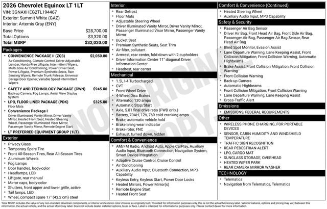 2-Way Power Driver Lumbar Control Seat Adjuster, 4-Wheel Disc Brakes, 5.81 Final Drive Axle Ratio, 6 Speakers, ABS brakes, Air Conditioning, All-Weather Floor Liners (LPO), Alloy wheels, AM/FM radio: SiriusXM, Auto High-beam Headlights, AutoSense Hands-Free Power Programmable Liftgate, Brake assist, Bumpers: body-color, Cabin Humidity & Windshield Sensor, Cargo Mat, Cloth Seat Trim, Compass, Convenience Package II, Delay-off headlights, Driver 6-Way Manual Seat Adjuster, Driver 8-Way Power Seat Adjuster, Driver door bin, Driver vanity mirror, Dual front impact airbags, Dual front side impact airbags, Dual-Zone Automatic Climate Control, Electronic Stability Control, Emergency communication system: OnStar and Chevrolet connected services capable, Evotex Seat Trim, Floor Liner Package (LPO), Four wheel independent suspension, Front anti-roll bar, Front Bucket Seats, Front Center Armrest, Front Fog Lamps, Front Passenger 4-Way Manual Seat Adjuster, Front reading lights, Fully automatic headlights, HD Surround Vision, Heated door mirrors, Heated Driver & Front Passenger Seats, Heated front seats, Heated steering wheel, Heated Wiper Park, Illuminated entry, Intermittent Front Rain-Sensing Wipers, Low tire pressure warning, Navigation System, Occupant sensing airbag, Outside temperature display, Overhead airbag, Overhead console, Overhead Sunglass Storage, Panic alarm, Passenger door bin, Passenger vanity mirror, Power door mirrors, Power steering, Power windows, Preferred Equipment Group 1LT, Premium audio system: Chevrolet Infotainment 3, Programmable Universal Home Remote, Radio data system, Radio: 11.3 Diagonal Advanced Color LCD Display, Rear anti-roll bar, Rear Camera Mirror Washer, Rear Pedestrian Alert, Rear reading lights, Rear seat center armrest, Rear window defroster, Rear window wiper, Remote keyless entry, Safety & Technology Package, Second Row All-Weather Mat (LPO), Security system, SiriusXM w/360L Trial Subscription, Speed control, Speed-sensing steering, Split folding rear seat, Spoiler, Steering wheel mounted audio controls, Tachometer, Telescoping steering wheel, Tilt steering wheel, Traction control, Traffic Sign Recognition, Trip computer, Variably intermittent wipers, Wheels: 17 Grazen Metallic Machined-Face Aluminum, Wireless Phone Charging for Portable Devices.
