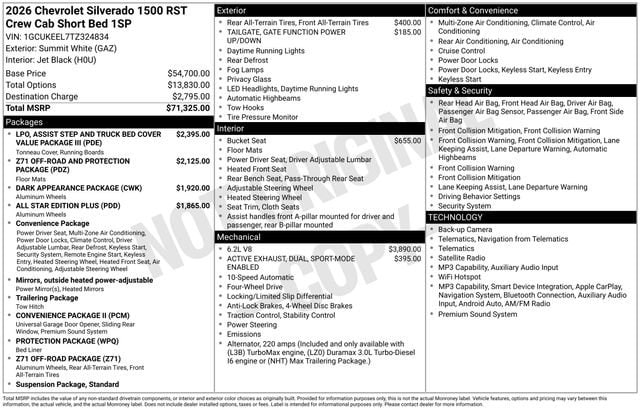 10-Way Power Driver Seat with Lumbar, 12.3 Multicolor Reconfigurable Digital Display, 120-Volt Bed Mounted Power Outlet, 120-Volt Interior Power Outlet, 170 Amp Alternator, 2 USB Data Ports, 220 Amp Alternator, 3.23 Rear Axle Ratio, 4-Wheel Disc Brakes, 40/20/40 Front Split-Bench Seat, 6 Speakers, 6-Speaker Audio System, 6 Rectangular Black Tubular Assist Steps, ABS brakes, Air Conditioning, All Star Edition Plus, All-Star Edition, All-Weather Floor Liner, Alloy wheels, AM/FM radio: SiriusXM with 360L, Apple CarPlay/Android Auto, Assist Step and Truck Bed Cover Value Package III, Auto High-beam Headlights, Auto-Locking Rear Differential, Automatic Emergency Braking, Automatic temperature control, Auxiliary External Transmission Oil Cooler, Black Tailgate CHEVROLET Lettering, Bluetooth® For Phone, Brake assist, Bumpers: body-color, Chevytec Spray-on Black Bedliner, Cloth Seat Trim, Color-Keyed Carpeting Floor Covering, Compass, Convenience Package, Convenience Package II, Dark Appearance Package, Deep-Tinted Glass, Delay-off headlights, Driver door bin, Driver vanity mirror, Dual Active Exhaust, Dual Exhaust with Polished Outlets, Dual front impact airbags, Dual front side impact airbags, Dual Rear USB Ports (charge Only), Dual-Zone Automatic Climate Control, Electric Rear-Window Defogger, Electronic Cruise Control, Electronic Stability Control, Electronic Transmission Range Selector Shifter, Emergency communication system: OnStar, External Engine Oil Cooler, EZ Lift Power Lock and Release Tailgate, Floor Mounted Center Console, Following Distance Indicator, Forward Collision Alert, Front anti-roll bar, Front Bucket Seats, Front Center Armrest w/Storage, Front dual zone A/C, Front fog lights, Front Frame-Mounted Black Recovery Hooks, Front LED Fog Lamps, Front Pedestrian Braking, Front reading lights, Front Rubberized Vinyl Floor Mats, Front wheel independent suspension, Fully automatic headlights, Hard Folding Truck Bed Cover, HD Rear Vision Camera, Heated door mirrors, Heated Driver and Front Outboard Passenger Seats, Heated front seats, Heated Power-Adjustable Outside Mirrors, Heated Steering Wheel, Heated steering wheel, Heavy-Duty Air Filter, High Capacity Suspension Package, High Gloss Black Mirror Caps, Hill Descent Control, Hitch Guidance, Hitch Guidance with Hitch View, Illuminated entry, in-Vehicle Trailering System App, Inside Rearview Mirror with Tilt, Integrated Trailer Brake Controller, IntelliBeam Automatic High Beam on/Off, Keyless Open and Start, Lane Keep Assist with Lane Departure Warning, LED Cargo Area Lighting, Low tire pressure warning, Manual Tilt/Telescoping Steering Column, Occupant sensing airbag, Off-Road Suspension, OnStar Services Capable, Outside temperature display, Overhead airbag, Overhead console, Panic alarm, Passenger door bin, Passenger vanity mirror, Power door mirrors, Power driver seat, Power Front Windows with Driver Express Up/Down, Power Front Windows with Passenger Express Down, Power Rear Windows with Express Down, Power Sliding Rear Window with Rear Defogger, Power steering, Power Tailgate, Power windows, Preferred Equipment Group 1SP, Premium audio system: Chevrolet Infotainment 3 Premium, Premium Bose 7-Speaker Sound System, Protection Package, Radio data system, Radio: Chevrolet Infotainment 3 Premium System, Rear 60/40 Folding Bench Seat (folds Up), Rear reading lights, Rear Rubberized-Vinyl Floor Mats, Rear step bumper, Rear Wheelhouse Liners, Rear window defroster, Remote keyless entry, Remote Vehicle Starter System, Security system, Single Outlet Exhaust, SiriusXM with 360L Trial Subscription, Speed control, Speed-sensing steering, Split folding rear seat, Standard Suspension Package, Standard Tailgate, Steer