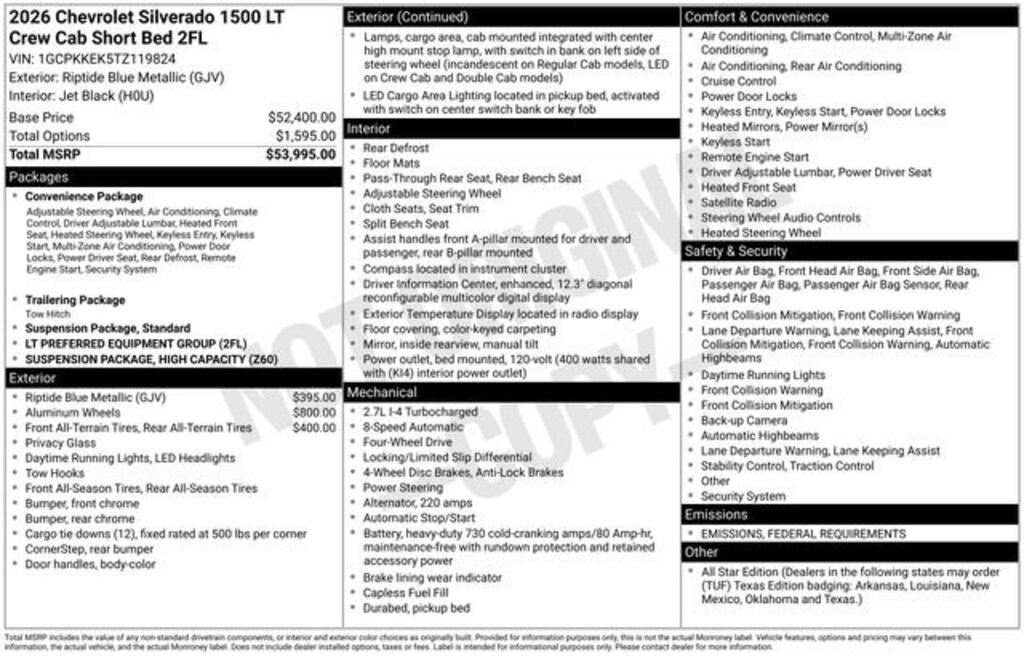 10-Way Power Driver Seat w/Lumbar, 12.3 Multicolor Reconfigurable Digital Display, 120-Volt Bed Mounted Power Outlet, 120-Volt Interior Power Outlet, 3.42 Rear Axle Ratio, 4-Wheel Disc Brakes, 40/20/40 Front Split-Bench Seat, 6 Speakers, 6-Speaker Audio System, ABS brakes, Air Conditioning, All-Star Edition, Alloy wheels, AM/FM radio: SiriusXM with 360L, Apple CarPlay/Android Auto, Auto High-beam Headlights, Auto-Locking Rear Differential, Automatic Emergency Braking, Automatic temperature control, Bluetooth® For Phone, Brake assist, Bumpers: chrome, Chrome Mirror Caps, Cloth Seat Trim, Color-Keyed Carpeting Floor Covering, Compass, Convenience Package, Deep-Tinted Glass, Delay-off headlights, Driver door bin, Driver vanity mirror, Dual front impact airbags, Dual front side impact airbags, Dual Rear USB Ports (Charge Only), Dual-Zone Automatic Climate Control, Electric Rear-Window Defogger, Electronic Cruise Control, Electronic Stability Control, Emergency communication system: OnStar, Following Distance Indicator, Forward Collision Alert, Front anti-roll bar, Front Center Armrest w/Storage, Front dual zone A/C, Front Frame-Mounted Black Recovery Hooks, Front Pedestrian Braking, Front reading lights, Front wheel independent suspension, Fully automatic headlights, HD Rear Vision Camera, Heated door mirrors, Heated Driver & Front Outboard Passenger Seats, Heated front seats, Heated Steering Wheel, Heated steering wheel, High Capacity Suspension Package, Hitch Guidance, Illuminated entry, Integrated Trailer Brake Controller, IntelliBeam Automatic High Beam On/Off, Keyless Open & Start, Lane Keep Assist w/Lane Departure Warning, LED Cargo Area Lighting, Low tire pressure warning, Manual Tilt/Telescoping Steering Column, Occupant sensing airbag, OnStar Services Capable, Outside temperature display, Overhead airbag, Overhead console, Panic alarm, Passenger door bin, Passenger vanity mirror, Power door mirrors, Power driver seat, Power Front Windows w/Driver Express Up/Down, Power Front Windows w/Passenger Express Down, Power Rear Windows w/Express Down, Power steering, Power windows, Premium audio system: Chevrolet Infotainment 3 Premium, Radio data system, Radio: Chevrolet Infotainment 3 Premium System, Rear 60/40 Folding Bench Seat (Folds Up), Rear reading lights, Rear step bumper, Rear window defroster, Remote keyless entry, Remote Vehicle Starter System, Security system, SiriusXM w/360L Trial Subscription, Speed control, Speed-sensing steering, Split folding rear seat, Standard Suspension Package, Steering Wheel Audio Controls, Steering wheel mounted audio controls, Tachometer, Teen Driver, Telescoping steering wheel, Theft Deterrent System (Unauthorized Entry), Tilt steering wheel, Tire Pressure Monitoring System, Traction control, Trailering Package, Trip computer, Variably intermittent wipers, Voltmeter, Wheels: 18 x 8.5 Bright Silver Painted Aluminum, Wheels: 20 x 9 Painted Aluminum, Wi-Fi Hot Spot Capable, Wrapped Steering Wheel.