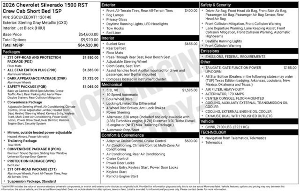 10-Way Power Driver Seat w/Lumbar, 12.3 Multicolor Reconfigurable Digital Display, 120-Volt Bed Mounted Power Outlet, 120-Volt Interior Power Outlet, 170 Amp Alternator, 2 USB Data Ports, 220 Amp Alternator, 3.23 Rear Axle Ratio, 4-Wheel Disc Brakes, 40/20/40 Front Split-Bench Seat, 6 Speakers, 6-Speaker Audio System, ABS brakes, Adaptive Cruise Control, Air Conditioning, All Star Edition Plus, All-Star Edition, All-Weather Floor Liner (LPO) (AAK), Alloy wheels, AM/FM radio: SiriusXM with 360L, Apple CarPlay/Android Auto, Auto High-beam Headlights, Auto-Locking Rear Differential, Automatic Emergency Braking, Automatic temperature control, Auxiliary External Transmission Oil Cooler, Black Tailgate CHEVROLET Lettering (LPO), Bluetooth® For Phone, Brake assist, Bumpers: body-color, Chevytec Spray-On Black Bedliner, Cloth Seat Trim, Color-Keyed Carpeting Floor Covering, Compass, Convenience Package, Convenience Package II, Dark Appearance Package, Deep-Tinted Glass, Delay-off headlights, Driver door bin, Driver vanity mirror, Dual Exhaust w/Polished Outlets, Dual front impact airbags, Dual front side impact airbags, Dual Rear USB Ports (Charge Only), Dual-Zone Automatic Climate Control, Electric Rear-Window Defogger, Electronic Cruise Control, Electronic Stability Control, Electronic Transmission Range Selector Shifter, Emergency communication system: OnStar, External Engine Oil Cooler, EZ Lift Power Lock & Release Tailgate, Floor Mounted Center Console, Following Distance Indicator, Forward Collision Alert, Front anti-roll bar, Front Bucket Seats, Front Center Armrest w/Storage, Front dual zone A/C, Front fog lights, Front Frame-Mounted Black Recovery Hooks, Front LED Fog Lamps, Front Pedestrian Braking, Front reading lights, Front Rubberized Vinyl Floor Mats, Front wheel independent suspension, Fully automatic headlights, HD Rear Vision Camera, HD Surround Vision, Heated door mirrors, Heated Driver & Front Outboard Passenger Seats, Heated front seats, Heated Power-Adjustable Outside Mirrors, Heated Steering Wheel, Heated steering wheel, Heavy-Duty Air Filter, High Capacity Suspension Package, High Gloss Black Mirror Caps, Hill Descent Control, Hitch Guidance, Hitch Guidance w/Hitch View, Illuminated entry, In-Vehicle Trailering System App, Inside Rear-View Mirror w/Tilt, Integrated Trailer Brake Controller, IntelliBeam Automatic High Beam On/Off, Keyless Open & Start, Lane Keep Assist w/Lane Departure Warning, LED Cargo Area Lighting, Low tire pressure warning, Manual Tilt/Telescoping Steering Column, Occupant sensing airbag, Off-Road Suspension, OnStar Services Capable, Outside temperature display, Overhead airbag, Overhead console, Panic alarm, Passenger door bin, Passenger vanity mirror, Perimeter Lighting, Power door mirrors, Power driver seat, Power Front Windows w/Driver Express Up/Down, Power Front Windows w/Passenger Express Down, Power Rear Windows w/Express Down, Power Sliding Rear Window w/Rear Defogger, Power steering, Power Tailgate, Power windows, Preferred Equipment Group 1SP, Premium audio system: Chevrolet Infotainment 3 Premium, Premium Bose 7-Speaker Sound System, Protection Package, Radio data system, Radio: Chevrolet Infotainment 3 Premium System, Rear 60/40 Folding Bench Seat (Folds Up), Rear Cross Traffic Braking, Rear Pedestrian Alert, Rear reading lights, Rear Rubberized-Vinyl Floor Mats, Rear step bumper, Rear Wheelhouse Liners, Rear window defroster, Remote keyless entry, Remote Vehicle Starter System, Safety Package, Security system, Single Outlet Exhaust, SiriusXM w/360L Trial Subscription, Speed control, Speed-sensing steering, Split folding rear seat, Standard Suspension Package, Standard Tailgate, Steering Wheel Audio Con