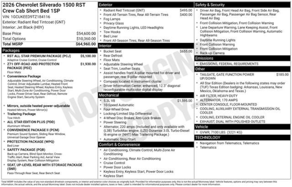 10-Way Power Driver Seat w/Lumbar, 12.3 Multicolor Reconfigurable Digital Display, 120-Volt Bed Mounted Power Outlet, 120-Volt Interior Power Outlet, 170 Amp Alternator, 2 USB Data Ports, 220 Amp Alternator, 3.23 Rear Axle Ratio, 4-Wheel Disc Brakes, 40/20/40 Front Split-Bench Seat, 6 Speakers, 6-Speaker Audio System, ABS brakes, Adaptive Cruise Control, Air Conditioning, All Star Edition Plus, All-Star Edition, All-Weather Floor Liner (LPO) (AAK), Alloy wheels, AM/FM radio: SiriusXM with 360L, Apple CarPlay/Android Auto, Auto High-beam Headlights, Auto-Locking Rear Differential, Automatic Emergency Braking, Automatic temperature control, Auxiliary External Transmission Oil Cooler, Bluetooth® For Phone, Brake assist, Bumpers: body-color, Chevytec Spray-On Black Bedliner, Cloth Seat Trim, Color-Keyed Carpeting Floor Covering, Compass, Convenience Package, Convenience Package II, Deep-Tinted Glass, Delay-off headlights, Driver door bin, Driver vanity mirror, Dual Exhaust w/Polished Outlets, Dual front impact airbags, Dual front side impact airbags, Dual Rear USB Ports (Charge Only), Dual-Zone Automatic Climate Control, Electric Rear-Window Defogger, Electronic Cruise Control, Electronic Stability Control, Electronic Transmission Range Selector Shifter, Emergency communication system: OnStar, External Engine Oil Cooler, EZ Lift Power Lock & Release Tailgate, Floor Mounted Center Console, Following Distance Indicator, Forward Collision Alert, Front anti-roll bar, Front Bucket Seats, Front Center Armrest w/Storage, Front dual zone A/C, Front fog lights, Front Frame-Mounted Black Recovery Hooks, Front LED Fog Lamps, Front Pedestrian Braking, Front reading lights, Front Rubberized Vinyl Floor Mats, Front wheel independent suspension, Fully automatic headlights, HD Rear Vision Camera, HD Surround Vision, Heated door mirrors, Heated Driver & Front Outboard Passenger Seats, Heated front seats, Heated Power-Adjustable Outside Mirrors, Heated Steering Wheel, Heated steering wheel, Heavy-Duty Air Filter, High Gloss Black Mirror Caps, Hill Descent Control, Hitch Guidance, Hitch Guidance w/Hitch View, Illuminated entry, In-Vehicle Trailering System App, Inside Rear-View Mirror w/Tilt, Integrated Trailer Brake Controller, IntelliBeam Automatic High Beam On/Off, Keyless Open & Start, Lane Keep Assist w/Lane Departure Warning, Leather Package, Leather-Appointed Front Seat Trim, LED Cargo Area Lighting, Low tire pressure warning, Manual Tilt/Telescoping Steering Column, Occupant sensing airbag, Off-Road Suspension, OnStar Services Capable, Outside temperature display, Overhead airbag, Overhead console, Panic alarm, Passenger door bin, Passenger vanity mirror, Perimeter Lighting, Power door mirrors, Power driver seat, Power Front Windows w/Driver Express Up/Down, Power Front Windows w/Passenger Express Down, Power Rear Windows w/Express Down, Power Sliding Rear Window w/Rear Defogger, Power steering, Power Tailgate, Power windows, Preferred Equipment Group 1SP, Premium audio system: Chevrolet Infotainment 3 Premium, Premium Bose 7-Speaker Sound System, Protection Package, Radio data system, Radio: Chevrolet Infotainment 3 Premium System, Rear 60/40 Folding Bench Seat (Folds Up), Rear Cross Traffic Braking, Rear Pedestrian Alert, Rear reading lights, Rear Rubberized-Vinyl Floor Mats, Rear step bumper, Rear Wheelhouse Liners, Rear window defroster, Remote keyless entry, Remote Vehicle Starter System, RST All Star Premium Package, Safety Package, Security system, Single Outlet Exhaust, SiriusXM w/360L Trial Subscription, Speed control, Speed-sensing steering, Split folding rear seat, Standard Suspension Package, Standard Tailgate, Steering Wheel Audio Controls, Steering wheel