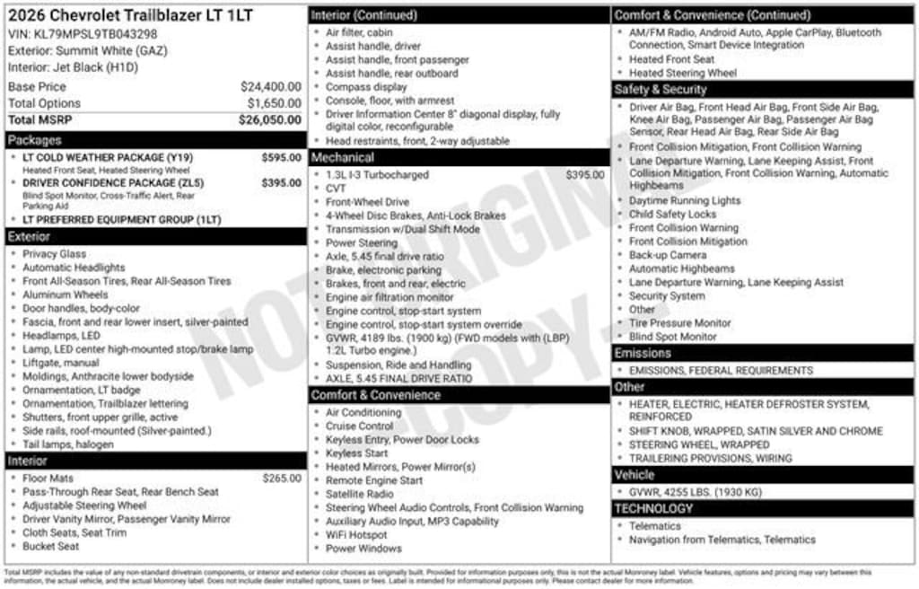 1 Type-A & 1 Type-C USB Ports, 4-Way Manual Front Passenger Seat Adjuster, 4-Wheel Disc Brakes, 5.45 Final Drive Axle Ratio, 6 Speakers, 6-Way Manual Driver Seat Adjuster, ABS brakes, Air Conditioning, Alloy wheels, AM/FM radio: SiriusXM, Auto High-beam Headlights, Brake assist, Bumpers: body-color, Cloth Seat Trim, Compass, Delay-off headlights, Driver Confidence Package, Driver door bin, Driver vanity mirror, Dual front impact airbags, Dual front side impact airbags, Electronic Stability Control, Emergency communication system: OnStar and Chevrolet connected services capable, Enhanced Performance 6-Speaker Audio System, Exterior Parking Camera Rear, Flat-Folding Front Passenger Seatback, Front & Rear All-Weather Floor Liners (LPO), Front anti-roll bar, Front Bucket Seats, Front Center Armrest, Front reading lights, Front wheel independent suspension, Fully automatic headlights, Heated door mirrors, Heated Driver & Front Passenger Seats, Heated Steering Wheel, Illuminated entry, Knee airbag, Lane Change Alert w/Side Blind Zone Alert, Low tire pressure warning, LT Cold Weather Package, Occupant sensing airbag, Overhead airbag, Overhead console, Panic alarm, Passenger door bin, Passenger vanity mirror, Power door mirrors, Power steering, Power windows, Preferred Equipment Group 1LT, Radio data system, Radio: AM/FM Stereo Audio System, Rear Cross Traffic Alert, Rear Park Assist, Rear side impact airbag, Rear window defroster, Rear window wiper, Reinforced Electric Heater/Defroster System, Remote keyless entry, Ride & Handling Suspension, Satin Silver & Chrome Wrapped Shift Knob, Security system, SiriusXM Trial Subscription, Speed control, Split folding rear seat, Spoiler, Steering wheel mounted audio controls, Tachometer, Telescoping steering wheel, Tilt steering wheel, Traction control, Trip computer, Variably intermittent wipers, Wheels: 17 High Gloss Black Machined Aluminum, Wireless Apple CarPlay/Android Auto, Wrapped Steering Wheel.