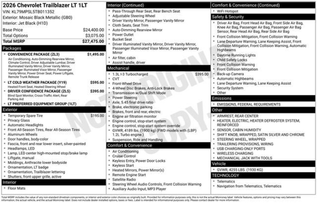1 Type-A & 1 Type-C USB Charging-Only Ports, 1 Type-A & 1 Type-C USB Ports, 120-Volt Power Outlet, 2-Way Power Driver Lumbar Seat Adjuster, 4-Way Manual Front Passenger Seat Adjuster, 4-Wheel Disc Brakes, 5.45 Final Drive Axle Ratio, 6 Speakers, 6-Way Manual Driver Seat Adjuster, 8-Way Power Driver Seat Adjuster, ABS brakes, Air Conditioning, Alloy wheels, AM/FM radio: SiriusXM, Auto High-beam Headlights, Brake assist, Bumpers: body-color, Cabin Humidity Sensor, Cloth Seat Trim, Compass, Convenience Package, Delay-off headlights, Dr & Fr Passenger Illuminated Vanity Mirrors, Driver Confidence Package, Driver door bin, Driver vanity mirror, Dual front impact airbags, Dual front side impact airbags, Electronic Stability Control, Emergency communication system: OnStar and Chevrolet connected services capable, Enhanced Performance 6-Speaker Audio System, Exterior Parking Camera Rear, Flat-Folding Front Passenger Seatback, Front anti-roll bar, Front Bucket Seats, Front Center Armrest, Front reading lights, Front wheel independent suspension, Fully automatic headlights, Heated door mirrors, Heated Driver & Front Passenger Seats, Heated Steering Wheel, Illuminated entry, Inside Rear-View Auto-Dimming Mirror, Knee airbag, Lane Change Alert w/Side Blind Zone Alert, Low tire pressure warning, LT Cold Weather Package, Mechanical Jack w/Tools, Occupant sensing airbag, Overhead airbag, Overhead console, Panic alarm, Passenger door bin, Passenger vanity mirror, Power door mirrors, Power Liftgate, Power steering, Power windows, Preferred Equipment Group 1LT, Radio data system, Radio: AM/FM Stereo Audio System, Rear Center Armrest, Rear Cross Traffic Alert, Rear Park Assist, Rear side impact airbag, Rear window defroster, Rear window wiper, Reinforced Electric Heater/Defroster System, Remote keyless entry, Ride & Handling Suspension, Satin Silver & Chrome Wrapped Shift Knob, Security system, Single-Zone Automatic Climate Control, SiriusXM Trial Subscription, Speed control, Split folding rear seat, Spoiler, Steering wheel mounted audio controls, Tachometer, Telescoping steering wheel, Tilt steering wheel, Traction control, Trip computer, Variably intermittent wipers, Wheels: 17 High Gloss Black Machined Aluminum, Wireless Apple CarPlay/Android Auto, Wireless Charging, Wrapped Steering Wheel.