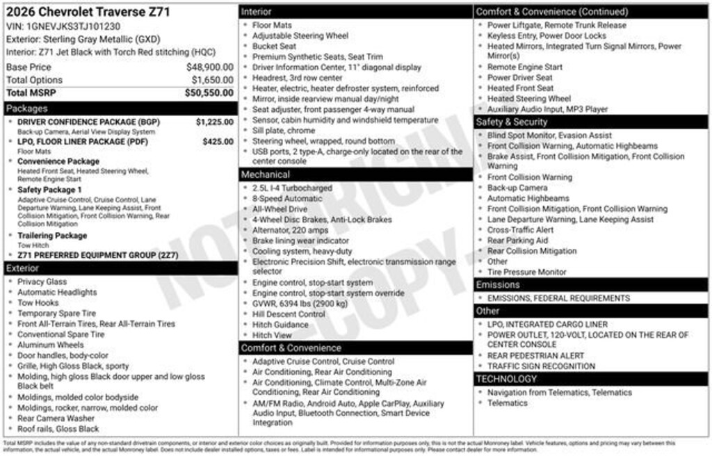 1st & 2nd Row All-Weather Floor Liners (LPO), 3rd Row All-Weather Floor Liner (LPO), 3rd row seats: split-bench, 4-Way Manual Front Passenger Seat Adjuster, 4-Wheel Disc Brakes, 6 Speakers, 6-Speaker Audio System Feature, 8-Way Power Driver Seat Adjuster, ABS brakes, Air Conditioning, Alloy wheels, AM/FM radio: SiriusXM with 360L, Apple CarPlay/Android Auto, Auto High-beam Headlights, Automatic temperature control, Brake assist, Child-Seat-Sensing Airbag, Compass, Delay-off headlights, Driver Confidence Package, Driver door bin, Driver vanity mirror, Dual front impact airbags, Dual front side impact airbags, Electronic Stability Control, Emergency communication system: OnStar, Evotex Seat Trim, Floor Liner Package (LPO), Four wheel independent suspension, Front anti-roll bar, Front Bucket Seats, Front Center Armrest, Front dual zone A/C, Front reading lights, Fully automatic headlights, HD Surround Vision, Heated door mirrors, Heated Driver & Front Passenger Seats, Heated front seats, Heated steering wheel, Illuminated entry, Integrated Cargo Liner (LPO), Key Card, Low tire pressure warning, Navigation System, Occupant sensing airbag, Outside temperature display, Overhead airbag, Overhead console, Panic alarm, Passenger door bin, Passenger vanity mirror, Power door mirrors, Power driver seat, Power Liftgate, Power Outlet, Power steering, Power windows, Preferred Equipment Group 2Z7, Radio data system, Radio: Audio System w/17.7 Diagonal Display, Rear air conditioning, Rear anti-roll bar, Rear Camera Mirror, Rear Pedestrian Alert, Rear reading lights, Rear window defroster, Rear window wiper, Remote keyless entry, Security system, SiriusXM w/360L Trial Subscription, Speed control, Speed-sensing steering, Spoiler, Steering wheel mounted audio controls, Tachometer, Telescoping steering wheel, Tilt steering wheel, Traction control, Traffic Sign Recognition, Trip computer, Turn signal indicator mirrors, Variably intermittent wipers, Voltmeter, Wheels: 18 High Gloss Black Painted Aluminum.