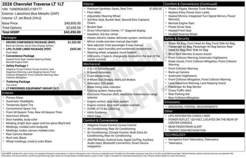 1st & 2nd Row All-Weather Floor Liners (LPO), 3rd Row All-Weather Floor Liner (LPO), 3rd row seats: split-bench, 4-Way Manual Front Passenger Seat Adjuster, 4-Wheel Disc Brakes, 6 Speakers, 6-Speaker Audio System Feature, 8-Way Power Driver Seat Adjuster, ABS brakes, Air Conditioning, Alloy wheels, AM/FM radio: SiriusXM with 360L, Apple CarPlay/Android Auto, Auto High-beam Headlights, Automatic temperature control, Brake assist, Bumpers: body-color, Child-Seat-Sensing Airbag, Compass, Delay-off headlights, Driver Confidence Package, Driver door bin, Driver vanity mirror, Dual front impact airbags, Dual front side impact airbags, Electronic Stability Control, Emergency communication system: OnStar, Floor Liner Package (LPO), Four wheel independent suspension, Front anti-roll bar, Front Bucket Seats, Front Center Armrest, Front dual zone A/C, Front reading lights, Fully automatic headlights, HD Surround Vision, Heated door mirrors, Heated Driver & Front Passenger Seats, Heated front seats, Heated steering wheel, Illuminated entry, Integrated Cargo Liner (LPO), Key Card, Low tire pressure warning, Navigation System, Occupant sensing airbag, Outside temperature display, Overhead airbag, Overhead console, Panic alarm, Passenger door bin, Passenger vanity mirror, Power door mirrors, Power driver seat, Power Liftgate, Power Outlet, Power steering, Power windows, Preferred Equipment Group 1LT, Premium Cloth Seat Trim, Radio data system, Radio: Audio System w/17.7 Diagonal Display, Rear air conditioning, Rear anti-roll bar, Rear Camera Mirror, Rear Pedestrian Alert, Rear reading lights, Rear window defroster, Rear window wiper, Remote keyless entry, Security system, SiriusXM w/360L Trial Subscription, Speed control, Speed-sensing steering, Spoiler, Steering wheel mounted audio controls, Tachometer, Telescoping steering wheel, Tilt steering wheel, Traction control, Traffic Sign Recognition, Trip computer, Turn signal indicator mirrors, Variably intermittent wipers, Voltmeter, Wheels: 18 Grazen Metallic Machined-Face Aluminum.