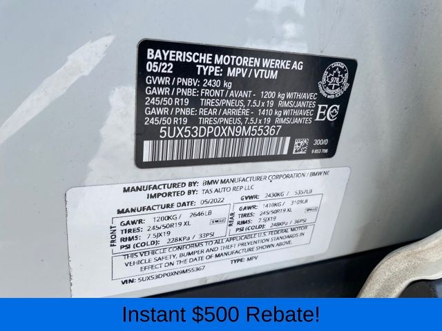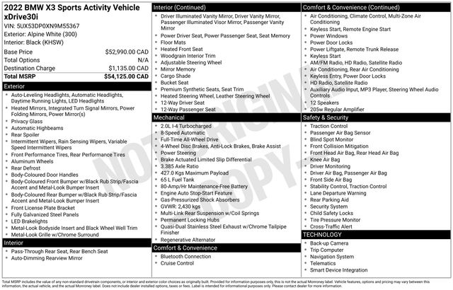Connected Package Pro, Navigation System, 12 Speakers, 3.385 Axle Ratio, 4-Wheel Disc Brakes, ABS brakes, Air Conditioning, Alloy wheels, AM/FM Radio, AM/FM radio: SiriusXM with 360L, Apple CarPlay & Android Auto Compatibility, Auto High-beam Headlights, Auto-dimming door mirrors, Auto-dimming Rear-View mirror, Automatic temperature control, BMW Assist eCall, BMW TeleServices, Brake assist, Bumpers: body-color, ConnectedDrive Services, Delay-off headlights, Driver door bin, Driver vanity mirror, Dual front impact airbags, Dual front side impact airbags, Electronic Stability Control, Emergency communication system: BMW Assist eCall, Enhanced Bluetooth, Exterior Parking Camera Rear, Four wheel independent suspension, Front anti-roll bar, Front Bucket Seats, Front Center Armrest, Front dual zone A/C, Front reading lights, Fully automatic headlights, Garage door transmitter, Genuine wood dashboard insert, Genuine wood door panel insert, Heated door mirrors, Hi-Fi Sound System, Illuminated entry, Knee airbag, Low tire pressure warning, Memory seat, Navigation, Occupant sensing airbag, Outside temperature display, Overhead airbag, Panic alarm, Passenger door bin, Passenger vanity mirror, Perforated SensaTec Upholstery, Power door mirrors, Power driver seat, Power Front Seats, Power Liftgate, Power passenger seat, Power steering, Power windows, Radio data system, Rain sensing wipers, Rear air conditioning, Rear anti-roll bar, Rear reading lights, Rear seat center armrest, Rear window defroster, Rear window wiper, Remote keyless entry, Roof rack: rails only, Security system, SiriusXM w/360L, Speed control, Speed-sensing steering, Speed-Sensitive Wipers, Split folding rear seat, Spoiler, Sport Seats, Sport steering wheel, Steering wheel mounted audio controls, Tachometer, Telescoping steering wheel, Tilt steering wheel, Traction control, Trip computer, Turn signal indicator mirrors, Variably intermittent wipers, Wheels: 19" x 7.5" Y-Spoke (Style 693), WiFi Hotspot, Connected Package Pro, Navigation System.