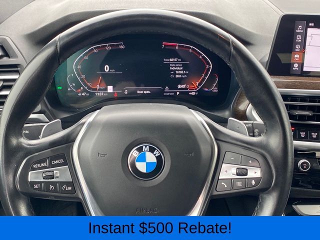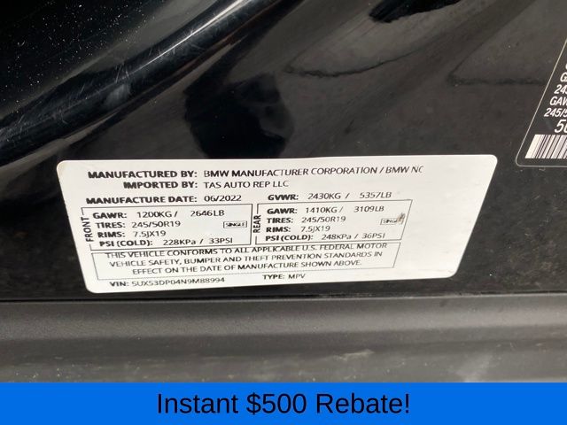 12 Speakers, 3.385 Axle Ratio, 4-Wheel Disc Brakes, ABS brakes, Air Conditioning, Alloy wheels, AM/FM Radio, AM/FM radio: SiriusXM with 360L, Apple CarPlay & Android Auto Compatibility, Auto High-beam Headlights, Auto-dimming door mirrors, Auto-dimming Rear-View mirror, Automatic temperature control, BMW Assist eCall, BMW TeleServices, Brake assist, Bumpers: body-color, Connected Package Pro, ConnectedDrive Services, Delay-off headlights, Driver door bin, Driver vanity mirror, Dual front impact airbags, Dual front side impact airbags, Electronic Stability Control, Emergency communication system: BMW Assist eCall, Enhanced Bluetooth, Exterior Parking Camera Rear, Four wheel independent suspension, Front anti-roll bar, Front Bucket Seats, Front Center Armrest, Front dual zone A/C, Front reading lights, Fully automatic headlights, Garage door transmitter, Genuine wood dashboard insert, Genuine wood door panel insert, Heated door mirrors, Hi-Fi Sound System, Illuminated entry, Knee airbag, Low tire pressure warning, Memory seat, Navigation, Navigation System, Occupant sensing airbag, Outside temperature display, Overhead airbag, Panic alarm, Passenger door bin, Passenger vanity mirror, Perforated SensaTec Upholstery, Power door mirrors, Power driver seat, Power Front Seats, Power Liftgate, Power passenger seat, Power steering, Power windows, Radio data system, Rain sensing wipers, Rear air conditioning, Rear anti-roll bar, Rear reading lights, Rear seat center armrest, Rear window defroster, Rear window wiper, Remote keyless entry, Roof rack: rails only, Security system, SiriusXM w/360L, Speed control, Speed-sensing steering, Speed-Sensitive Wipers, Split folding rear seat, Spoiler, Sport Seats, Sport steering wheel, Steering wheel mounted audio controls, Tachometer, Telescoping steering wheel, Tilt steering wheel, Traction control, Trip computer, Turn signal indicator mirrors, Variably intermittent wipers, Wheels: 19" x 7.5" Y-Spoke (Style 693), WiFi Hotspot.