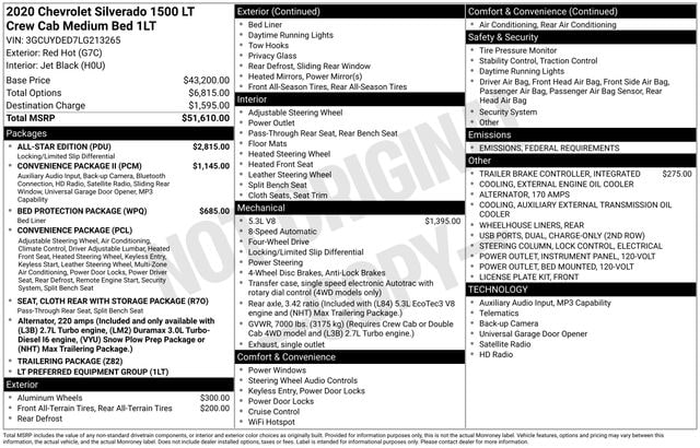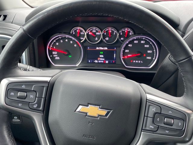 10-Way Power Driver Seat w/Lumbar, 12-Volt Rear Auxiliary Power Outlet, 120-Volt Bed Mounted Power Outlet, 120-Volt Instrument Panel Power Outlet, 170 Amps Alternator, 2 USB Ports, 2 USB Ports (First Row), 220 Amps Alternator, 3.23 Rear Axle Ratio, 4-Way Manual Driver Seat Adjuster, 4-Wheel Disc Brakes, 4.2" Diagonal Color Display Driver Info Center, 40/20/40 Front Split Bench Seat, 40/20/40 Front Split-Bench Seat, 4G LTE Wi-Fi Hot Spot Capable, 6 Speakers, ABS brakes, Air Conditioning, All-Star Edition, Alloy wheels, Apple CarPlay/Android Auto, Auxiliary External Transmission Oil Cooler, Bed Protection Package, Bluetooth® For Phone, Brake assist, Bumpers: chrome, Chevrolet Connected Access Capable, Chevytec Spray-On Black Bedliner, Chrome Grille, Chrome Mirror Caps, Cloth Rear Seat w/Storage Package, Cloth Seat Trim, Color-Keyed Carpeting Floor Covering, Compass, Convenience Package, Convenience Package II, Deep-Tinted Glass, Delay-off headlights, Driver door bin, Driver vanity mirror, Dual front impact airbags, Dual front side impact airbags, Dual-Zone Automatic Climate Control, Electric Rear-Window Defogger, Electrical Lock Control Steering Column, Electronic Stability Control, External Engine Oil Cooler, EZ Lift Power Lock & Release Tailgate, Front anti-roll bar, Front Center Armrest w/Storage, Front Frame-Mounted Black Recovery Hooks, Front License Plate Kit, Front reading lights, Front Rubberized Vinyl Floor Mats, Front wheel independent suspension, Fully automatic headlights, HD Radio, HD Rear Vision Camera, Heated door mirrors, Heated Driver & Front Outboard Passenger Seats, Heated Steering Wheel, Heavy Duty Suspension, Heavy-Duty Rear Locking Differential, Hitch Guidance, Illuminated entry, Integrated Trailer Brake Controller, Keyless Open & Start, Leather Wrapped Steering Wheel, LED Cargo Area Lighting, Locking Tailgate, Low tire pressure warning, Manual Tilt-Wheel Steering Column, Manual Tilt/Telescoping Steering Column, Occupant sensing airbag, OnStar & Chevrolet Connected Services Capable, Outside temperature display, Overhead airbag, Overhead console, Panic alarm, Passenger door bin, Passenger vanity mirror, Power Door Locks, Power door mirrors, Power Front Windows w/Driver Express Up/Down, Power Front Windows w/Passenger Express Down, Power Rear Windows w/Express Down, Power Sliding Rear Window w/Rear Defogger, Power steering, Power windows, Preferred Equipment Group 1LT, Radio data system, Radio: Chevrolet Infotainment 3 Plus System, Radio: Chevrolet Infotainment 3 System, Rear 60/40 Folding Bench Seat (Folds Up), Rear Dual USB Charging-Only Ports, Rear reading lights, Rear Rubberized-Vinyl Floor Mats, Rear step bumper, Rear Vision Camera, Rear Wheelhouse Liners, Remote Keyless Entry, Remote keyless entry, Remote Vehicle Starter System, Single-Zone Manual/Semi-Automatic Air Conditioning, SiriusXM w/360L, Speed control, Speed-sensing steering, Split folding rear seat, Steering Wheel Audio Controls, Steering wheel mounted audio controls, Steering Wheel Mounted Electronic Cruise Control, Tachometer, Theft Deterrent System (Unauthorized Entry), Tilt steering wheel, Traction control, Trailering Package, Trip computer, Universal Home Remote, Urethane Steering Wheel, Variably intermittent wipers,
