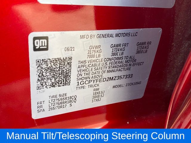 10-Way Power Driver Seat w/Lumbar, 12-Volt Rear Auxiliary Power Outlet, 170 Amp Alternator, 2 USB Ports (First Row), 4.2" Diagonal Color Display Driver Info Center, 6-Speaker Audio System, All-Weather Floor Liner (LPO) (AAK), Auto-Locking Rear Differential, Auxiliary External Transmission Oil Cooler, Bed Protection Package, Bluetooth® For Phone, Chevytec Spray-On Black Bedliner, Cloth Rear Seat w/Storage Package, Color-Keyed Carpeting Floor Covering, Compass, Convenience Package w/Buckets Seats, Deep-Tinted Glass, Dual Exhaust w/Polished Outlets, Dual-Zone Automatic Climate Control, Electric Rear-Window Defogger, Electrical Lock Control Steering Column, Electronic Cruise Control, EZ Lift Power Lock & Release Tailgate, Floor Mounted Center Console, Front LED Fog Lamps, Heated Driver & Front Outboard Passenger Seats, Heated Steering Wheel, High Gloss Black Grille, High Gloss Black Mirror Caps, Hitch Guidance, Keyless Open & Start, Leather Wrapped Steering Wheel, LED Cargo Area Lighting, LED Reflector Headlamps, Manual Tilt/Telescoping Steering Column, OnStar & Chevrolet Connected Services Capable, Performance Red Recovery Hooks, Power Door Locks, Power Front Windows w/Driver Express Up/Down, Power Front Windows w/Passenger Express Down, Power Rear Windows w/Express Down, Preferred Equipment Group 2LT, Rear Dual USB Charging-Only Ports, Rear Vision Camera, Rear Wheelhouse Liners, Remote Vehicle Starter System, SiriusXM Radio, Standard Tailgate, Steering Wheel Audio Controls, Suspension Package, Theft Deterrent System (Unauthorized Entry), Trailering Package, 3.23 Rear Axle Ratio, 4-Wheel Disc Brakes, 4G LTE Wi-Fi Hot Spot Capable, 6 Speakers, ABS brakes, Air Conditioning, Alloy wheels, AM/FM radio: SiriusXM, Apple CarPlay/Android Auto, Automatic temperature control, Black Name Plates (LPO), Black Tailgate CHEVROLET Lettering (LPO), Brake assist, Chevrolet Connected Access Capable, Cloth Seat Trim, Dark Essentials Package (LPO), Delay-off headlights, Driver door bin, Driver vanity mirror, Dual front impact airbags, Dual front side impact airbags, Electronic Stability Control, Front anti-roll bar, Front Bucket Seats, Front Center Armrest w/Storage, Front dual zone A/C, Front fog lights, Front reading lights, Front wheel independent suspension, Fully automatic headlights, Heated door mirrors, Heated front seats, Heated steering wheel, Heavy-Duty Air Filter, Hill Descent Control, Illuminated entry, Integrated Trailer Brake Controller, Low tire pressure warning, Occupant sensing airbag, Off-Road Suspension w/2" Lift, Outside temperature display, Overhead airbag, Overhead console, Panic alarm, Passenger door bin, Passenger vanity mirror, Power door mirrors, Power driver seat, Power steering, Power windows, Premium audio system: Chevrolet Infotainment 3, Radio data system, Radio: Chevrolet Infotainment 3 System, Rear reading lights, Rear seat center armrest, Rear step bumper, Rear window defroster, Remote keyless entry, Security system, Speed control, Speed-sensing steering, Split folding rear seat, Steering wheel mounted audio controls, Tachometer, Telescoping steering wheel, Tilt steering wheel, Traction control, Trip computer, Variably intermittent wipers, Voltmeter, Wheel Locks (Set of 4) (LPO), Wheels: 18" x