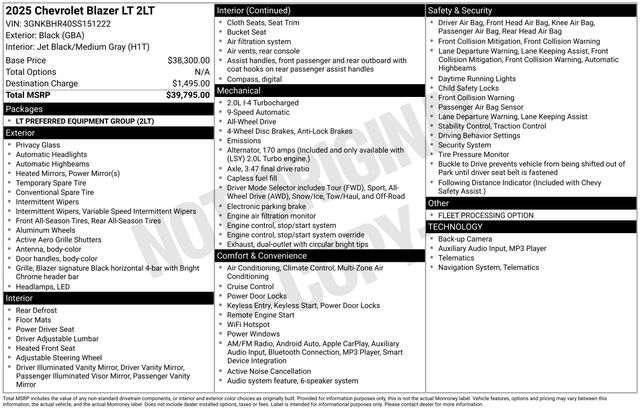 170 Amp Alternator, 3.47 Final Drive Axle Ratio, 4-Way Manual Front Passenger Seat Adjuster, 4-Wheel Disc Brakes, 6 Speakers, 6-Speaker Audio System Feature, 8-Way Power Driver Seat Adjuster, ABS brakes, Air Conditioning, Alloy wheels, AM/FM radio: SiriusXM with 360L, Apple CarPlay/Android Auto, Auto High-beam Headlights, Automatic temperature control, Brake assist, Bumpers: body-color, Child-Seat-Sensing Airbag, Compass, Delay-off headlights, Driver door bin, Driver vanity mirror, Dual front impact airbags, Dual front side impact airbags, Electronic Stability Control, Emergency communication system: OnStar and Chevrolet connected services capable, Four wheel independent suspension, Front anti-roll bar, Front Bucket Seats, Front Center Armrest, Front dual zone A/C, Front reading lights, Fully automatic headlights, Heated door mirrors, Heated Driver and Front Passenger Seats, Heated front seats, Illuminated entry, Knee airbag, Leather Shift Knob, Low tire pressure warning, Occupant sensing airbag, Outside temperature display, Overhead airbag, Overhead console, Panic alarm, Passenger door bin, Passenger vanity mirror, Power door mirrors, Power Driver Lumbar Control, Power driver seat, Power steering, Power windows, Preferred Equipment Group 2LT, Premium audio system: Chevrolet Infotainment 3 Plus, Premium Cloth Seat Trim, Radio data system, Radio: Chevrolet Infotainment 3 Plus System, Rear anti-roll bar, Rear reading lights, Rear seat center armrest, Rear window defroster, Rear window wiper, Remote keyless entry, Ride and Handling Suspension, Security system, SiriusXM with 360L, Speed control, Speed-sensing steering, Split folding rear seat, Spoiler, Steering wheel mounted audio controls, Stop-Start Engine Control System, Tachometer, Telescoping steering wheel, Tilt steering wheel, Traction control, Trip computer, Variably intermittent wipers, Voltmeter, Wheels: : 18" Grazen Metallic Aluminum.