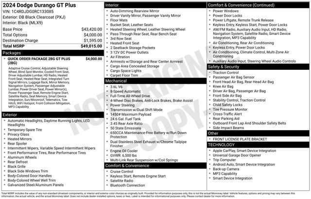 1-Year Trial (Registration Required), 10.1" Touchscreen Display, 115V Auxiliary Power Outlet, 180 Amp Alternator, 3.45 Rear Axle Ratio, 3rd row seats: split-bench, 4-Wheel Disc Brakes, 4G LTE Wi-Fi Hot Spot, 6 Speakers, 7 & 4 Pin Wiring Harness, ABS brakes, Adaptive Cruise Control w/Stop, Air Conditioning, Alloy wheels, AM/FM radio: SiriusXM, Apple CarPlay, Apple CarPlay/Android Auto, Auto-Dimming Exterior Driver Mirror, Auto-dimming Rear-View mirror, Automatic temperature control, Black Roof Rails, Blind Spot w/Trailer Detection, Brake assist, Bumpers: body-color, Class IV Receiver Hitch, Cloth Bucket Seats w/Shift Insert, Compass, Connected Travel & Traffic Services, Delay-off headlights, Disassociated Touchscreen Display, Driver door bin, Driver vanity mirror, Dual front impact airbags, Dual front side impact airbags, Dual Remote USB Port - Charge Only, Electronic Stability Control, Exterior Mirrors w/Heating Element, Exterior Mirrors w/Memory, Exterior Mirrors w/Supplemental Signals, Floor Console w/Leather Armrest, For Details Visit DriveUconnect.com, Four wheel independent suspension, Front anti-roll bar, Front Bucket Seats, Front Center Armrest w/Storage, Front dual zone A/C, Front License Plate Bracket, Front reading lights, Full Speed Forward Collision Warning Plus, Fully automatic headlights, Garage door transmitter, Global Telematics Box Module (TBM), Gloss Black Exterior Mirrors, Google Android Auto, GPS Antenna Input, GPS Navigation, HD Radio, Heated door mirrors, Heated front seats, Heated Second Row Seats, Heated steering wheel, Heavy-Duty Engine Cooling, Illuminated entry, Integrated Center Stack Radio, Integrated Roof Rail Crossbars, Integrated Voice Command w/Bluetooth, Knee airbag, Leather steering wheel, Leather Trimmed Bucket Seats, Leather Wrapped Door Panels, LED Auxiliary Low Beam & Turn Signal, Low tire pressure warning, Occupant sensing airbag, Outside temperature display, Overhead airbag, Overhead console, Panic alarm, ParkView Rear Back-Up Camera, Passenger door bin, Passenger vanity mirror, Power 6x9 Multi-Function Foldaway Mirrors, Power 8-Way Driver Memory 8-Way Passenger Seats, Power door mirrors, Power driver seat, Power Driver/Passenger 4-Way Lumbar Adjust, Power Liftgate, Power steering, Power Sunroof, Power Tilt & Telescopic Steering Column, Power windows, Quick Order Package 2BG GT Plus, Radio data system, Radio: Uconnect 4 w/8.4" Display, Radio: Uconnect 5 Nav w/10.1" Display, Radio/Driver Seat/Mirrors Memory, Rear air conditioning, Rear anti-roll bar, Rear Load Leveling Suspension, Rear reading lights, Rear seat center armrest, Rear window defroster, Rear window wiper, Red Accent Stitching, Remote keyless entry, SiriusXM Guardian - Included Trial (B), SiriusXM w/360L, Speed control, Speed-sensing steering, Speed-Sensitive Wipers, Split folding rear seat, Spoiler, Sport steering wheel, Steering wheel mounted audio controls, Tachometer, Telescoping steering wheel, Tilt steering wheel, Traction control, Trailer Brake Control, Trip computer, USB Host Flip, Variably intermittent wipers, Ventilated Front Seats, Voltmeter, Wheels: 20" x 8.0" Fine Silver.