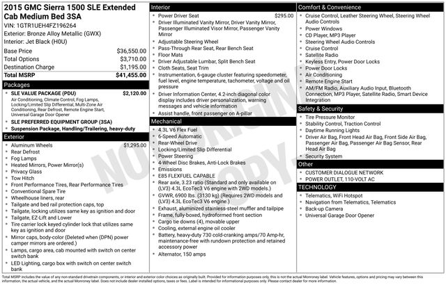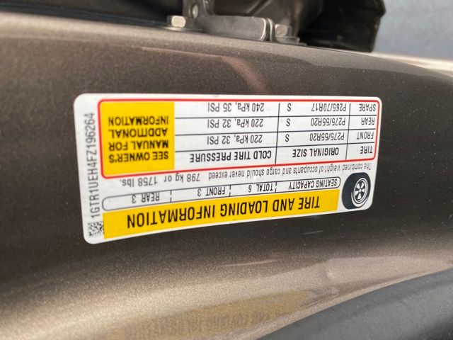 10-Way Power Driver's Seat Adjuster, 110-Volt AC Power Outlet, 150 Amp Alternator, 3.23 Rear Axle Ratio, 4-Wheel Disc Brakes, 4.2" Diagonal Color Display Driver Info Center, 40/20/40 Front Split Bench Seat, 6 Speakers, ABS brakes, Air Conditioning, Alloy wheels, AM/FM radio: SiriusXM, Body Color Bodyside Moldings, Body Color Door Handles, Body Color Power-Adjustable Heated Outside Mirrors, Body-Color Mirror Caps, Bodyside moldings, Brake assist, Bumpers: chrome, CD player, Chrome Grille Surround, Cloth Seat Trim, Color-Keyed Carpeting w/Rubberized Vinyl Floor Mats, Compass, Deep-Tinted Glass, Delay-off headlights, Driver & Front Passenger Illuminated Vanity Mirrors, Driver door bin, Driver vanity mirror, Dual front impact airbags, Dual front side impact airbags, Dual-Zone Automatic Climate Control, E85 FlexFuel Capable, Electric Rear-Window Defogger, Electronic Stability Control, Emergency communication system: OnStar Directions & Connections, Exterior Parking Camera Rear, EZ Lift & Lower Tailgate, Front anti-roll bar, Front Center Armrest w/Storage, Front Halogen Fog Lamps, Front reading lights, Front wheel independent suspension, Fully automatic headlights, Heated door mirrors, Heavy Duty Suspension, Heavy-Duty Rear Locking Differential, Illuminated entry, Leather Wrapped Steering Wheel w/Cruise Controls, LED Cargo Box Lighting, Low tire pressure warning, Manual Tilt Wheel Steering Column, Occupant sensing airbag, OnStar 6 Months Directions & Connections Plan, OnStar w/4G LTE, Outside temperature display, Overhead airbag, Overhead console, Panic alarm, Passenger door bin, Passenger vanity mirror, Power door mirrors, Power steering, Power windows, Power Windows w/Driver Express Up & Down, Preferred Equipment Group 3SA, Premium audio system: IntelliLink, Radio data system, Radio: AM/FM Stereo w/8" Diagonal Color Touch Screen, Rear 60/40 Folding Bench Seat (Folds Up), Rear reading lights, Rear seat center armrest, Rear step bumper, Rear Vision Camera w/Dynamic Guide Lines, Rear Wheelhouse Liners, Remote Keyless Entry, Remote keyless entry, Remote Vehicle Starter System, Single Slot CD/MP3 Player, Single-Zone Air Conditioning, SiriusXM Satellite Radio, SLE Value Package, Speed control, Speed-sensing steering, Split folding rear seat, Steering Wheel Audio Controls, Steering wheel mounted audio controls, Tachometer, Theft Deterrent System (Unauthorized Entry), Tilt steering wheel, Traction control, Trailering Equipment, Trip computer, Universal Home Remote, Variably intermittent wipers, Voltmeter, Wheels: 17" x 8" Bright Machined Aluminum, Wheels: 20" x 9" Ultra Bright Machined Aluminum.