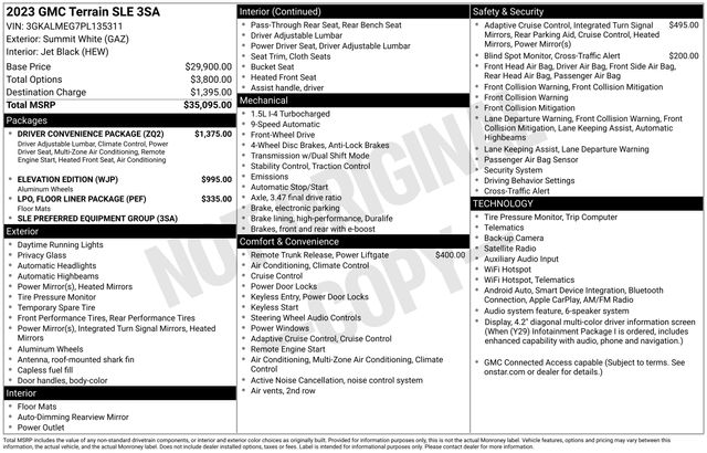 8-Way Power Driver Seat Adjuster, Adaptive Cruise Control, Black GMC Center Caps w/Red GMC Lettering, Black Mirror Caps, Darkened Front Grille, Driver & Front Passenger Heated Seats, Driver Convenience Package, Dual-Zone Automatic Climate Control, Elevation Edition, Lane Change Alert w/Side Blind Zone Alert, Outside Heated Power-Adjustable Mirrors, Rear Cross-Traffic Alert, Rear Park Assist, Remote Start, Roof-Mounted Luggage Rack Side Rails, Safety Alert Seat, Side Blind Zone & Rear Cross Traffic, Terrain Pro Safety Plus, Wheels: 19" Gloss Black Aluminum, 2 USB Data Ports w/Auxiliary Input Jack, 3.47 Axle Ratio, 4-Way Manual Driver's Seat, 4-Way Manual Front Passenger Seat, 4-Wheel Disc Brakes, 4.2" Multi-Color Driver Information Screen, 6 Speakers, 6-Speaker Audio System Feature, ABS brakes, Air Conditioning, Alloy wheels, AM/FM radio: SiriusXM, Auto High-beam Headlights, Auto-dimming Rear-View mirror, Automatic temperature control, Bluetooth® For Phone, Brake assist, Bumpers: body-color, Cold Air Grille Shutter, Compass, Delay-off headlights, Driver door bin, Driver vanity mirror, Dual front impact airbags, Dual front side impact airbags, Electronic Stability Control, Emergency communication system: OnStar and GMC connected services capable, Floor Liner Package (LPO), Four wheel independent suspension, Front & Rear All-Weather Floor Liners (LPO), Front anti-roll bar, Front Bucket Seats, Front Center Armrest, Front reading lights, Fully automatic headlights, Heated door mirrors, Illuminated entry, Integrated Cargo Liner (LPO), Low tire pressure warning, Occupant sensing airbag, Outside temperature display, Overhead airbag, Overhead console, Panic alarm, Passenger door bin, Passenger vanity mirror, Power door mirrors, Power Driver Lumbar Control, Power Programmable Rear Liftgate, Power steering, Power windows, Preferred Equipment Group 3SA, Premium Cloth Seat Trim, Radio data system, Radio: GMC Infotainment Audio System w/7" Display, Rear anti-roll bar, Rear seat center armrest, Rear window defroster, Rear window wiper, Remote keyless entry, Security system, SiriusXM Radio, Speed control, Speed-sensing steering, Split folding rear seat, Spoiler, Steering wheel mounted audio controls, Tachometer, Telescoping steering wheel, Tilt steering wheel, Traction control, Trip computer, Variably intermittent wipers, Wheels: 17" x 7" Silver Painted Aluminum, Wireless Apple CarPlay/Wireless Android Auto, 8-Way Power Driver Seat Adjuster, Adaptive Cruise Control, Black GMC Center Caps w/Red GMC Lettering, Black Mirror Caps, Darkened Front Grille, Driver & Front Passenger Heated Seats, Driver Convenience Package, Dual-Zone Automatic Climate Control, Elevation Edition, Lane Change Alert w/Side Blind Zone Alert, Outside Heated Power-Adjustable Mirrors, Rear Cross-Traffic Alert, Rear Park Assist, Remote Start, Roof-Mounted Luggage Rack Side Rails, Safety Alert Seat, Side Blind Zone & Rear Cross Traffic, Terrain Pro Safety Plus, Wheels: 19" Gloss Black Aluminum.