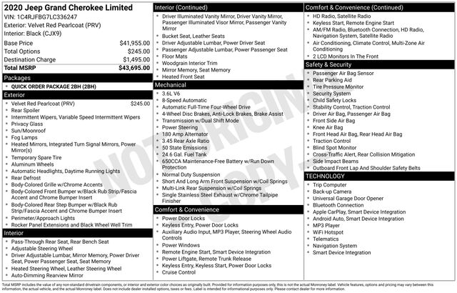 Navigation System, 1-Year SiriusXM Guardian Trial, 3.45 Rear Axle Ratio, 4-Wheel Disc Brakes, 4G LTE Wi-Fi Hot Spot, 6 Speakers, 8.4" Touchscreen Display, ABS brakes, Air Conditioning, Alloy wheels, AM/FM radio: SiriusXM, Anti-whiplash front head restraints, Apple CarPlay, Apple CarPlay/Android Auto, Audio memory, Auto-dimming door mirrors, Auto-dimming Rear-View mirror, Automatic temperature control, Brake assist, Bumpers: body-color, Compass, Delay-off headlights, Driver door bin, Driver vanity mirror, Dual front impact airbags, Dual front side impact airbags, Electronic Stability Control, Emergency communication system: SiriusXM Guardian, Engine Oil Cooler, Four wheel independent suspension, Front anti-roll bar, Front Bucket Seats, Front Center Armrest w/Storage, Front dual zone A/C, Front fog lights, Front reading lights, Fully automatic headlights, Garage door transmitter, Google Android Auto, GPS Antenna Input, GPS Navigation, HD Radio, Heated door mirrors, Heated front seats, Heated steering wheel, Illuminated entry, Integrated Center Stack Radio, Integrated Voice Command w/Bluetooth, Knee airbag, Leather Shift Knob, Leather Trimmed Bucket Seats, Low tire pressure warning, Manufacturer's Statement of Origin (DISC), Memory seat, Normal Duty Suspension, Occupant sensing airbag, Outside temperature display, Overhead airbag, Overhead console, Panic alarm, ParkView Rear Back-Up Camera, Passenger door bin, Passenger vanity mirror, Power door mirrors, Power driver seat, Power Liftgate, Power moonroof, Power passenger seat, Power steering, Power windows, Quadra-Trac II 4WD System, Quick Order Package 2BH, Radio data system, Radio: Uconnect 4C Nav w/8.4" Display, Rear anti-roll bar, Rear reading lights, Rear seat center armrest, Rear window defroster, Rear window wiper, Remote keyless entry, Security system, Selec-Terrain System, SiriusXM Satellite Radio, SiriusXM Traffic Plus, SiriusXM Travel Link, Speed control, Speed-sensing steering, Speed-Sensitive Wipers, Split folding rear seat, Spoiler, Steering wheel mounted audio controls, Tachometer, Telescoping steering wheel, Tilt steering wheel, Traction control, Trip computer, Turn signal indicator mirrors, USB Host Flip, Variably intermittent wipers, Voltmeter, Wheels: 18" x 8.0" Tech Gray Diamond Cut, Navigation System.