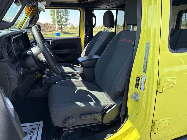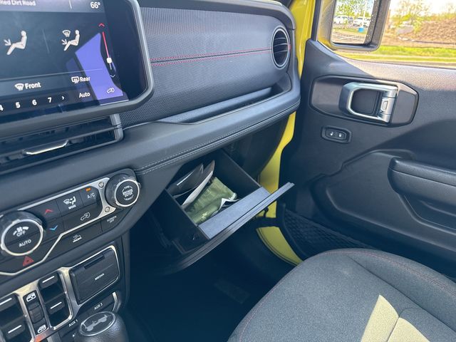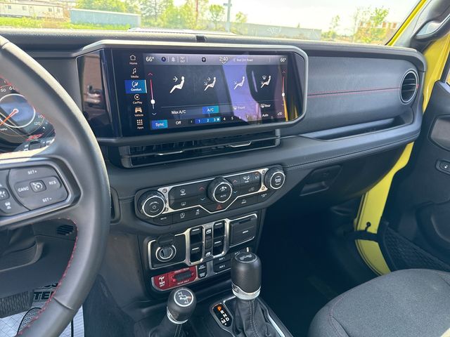 12.3" Touchscreen Display, 4-Wheel Disc Brakes, 4.10 Rear Axle Ratio, 8 Speakers, 97 MPH Vehicle Max Speed Calibration, ABS brakes, Air Conditioning, Alloy wheels, AM/FM radio: SiriusXM, Apple CarPlay, Apple CarPlay/Android Auto, Automatic temperature control, Aux Battery, Black 3-Piece Hard Top, Brake assist, Cloth Low-Back Bucket Seats, Compass, Connectivity - US/Canada, Delay-off headlights, Disassociated Touchscreen Display, Driver door bin, Driver vanity mirror, Dual front impact airbags, Dual front side impact airbags, Electronic Stability Control, Emergency communication system: Jeep Connect, Freedom Panel Storage Bag, Front anti-roll bar, Front Bucket Seats, Front Center Armrest w/Storage, Front dual zone A/C, Front fog lights, Front License Plate Bracket, Front reading lights, Fully automatic headlights, Google Android Auto, Heated door mirrors, Illuminated entry, Integrated Center Stack Radio, Integrated roll-over protection, Integrated Voice Command w/Bluetooth, Low tire pressure warning, No Soft Top, Non-Lock Fuel Cap w/o Discriminator, Occupant sensing airbag, Outside temperature display, Overhead airbag, Panic alarm, ParkView Rear Back-Up Camera, Passenger door bin, Passenger vanity mirror, Performance Suspension, Power door mirrors, Power steering, Power windows, Quick Order Package 24R Rubicon, Radio data system, Radio: Uconnect 5 w/12.3" Display, Rear anti-roll bar, Rear reading lights, Rear Window Defroster, Rear Window Wiper/Washer, Remote keyless entry, Security system, Speed control, Split folding rear seat, Steering wheel mounted audio controls, Stop-Start Dual Battery System, Tachometer, Telescoping steering wheel, Tilt steering wheel, Traction control, Trip computer, Variably intermittent wipers, Voltmeter, Wheels: 17" x 7.5" Machined/Painted Black.