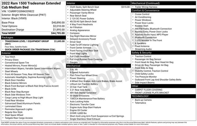 3 Rear Seat Head Restraints, 3.21 Rear Axle Ratio, 4 Way Front Headrests, 4-Wheel Disc Brakes, 40/20/40 Split Bench Seat, 48V Belt Starter Generator, 6 Speakers, ABS brakes, Air Conditioning, AM/FM radio, Black Exterior Mirrors, Brake assist, Carpet Floor Covering, Cloth 40/20/40 Bench Seat, Compass, Delay-off headlights, Driver door bin, Dual front impact airbags, Dual front side impact airbags, Electronic Stability Control, Emergency communication system: SiriusXM Guardian, Front & Rear Floor Mats, Front anti-roll bar, Front Center Armrest, Front Center Seat Cushion Storage, Front License Plate Bracket, Front reading lights, Front wheel independent suspension, Fully automatic headlights, Global Telematics Box Module (TBM), GPS Antenna Input, Heated door mirrors, Heavy Duty Vinyl 40/20/40 Split Bench Seat, Illuminated entry, Low tire pressure warning, Manual Adjust 4-Way Driver Seat, Manual Adjust 4-Way Front Passenger Seat, Occupant sensing airbag, Outside temperature display, Overhead airbag, Overhead console, Panic alarm, ParkView Rear Back-Up Camera, Passenger door bin, Passenger vanity mirror, Power door mirrors, Power steering, Power windows, Quick Order Package 23A Tradesman, Radio data system, Radio: Uconnect 3 w/5" Display, Rear anti-roll bar, Rear Folding Seat, Rear Power Sliding Window, Rear step bumper, Remote keyless entry, Seat Parts Module II, SiriusXM Radio Service, SiriusXM Satellite Radio, Speed control, Tachometer, Telescoping steering wheel, Tilt steering wheel, Traction control, Tradesman Level 1 Equipment Group, Variably intermittent wipers, Voltmeter, Wheels: 18" x 7.5" Steel Painted.