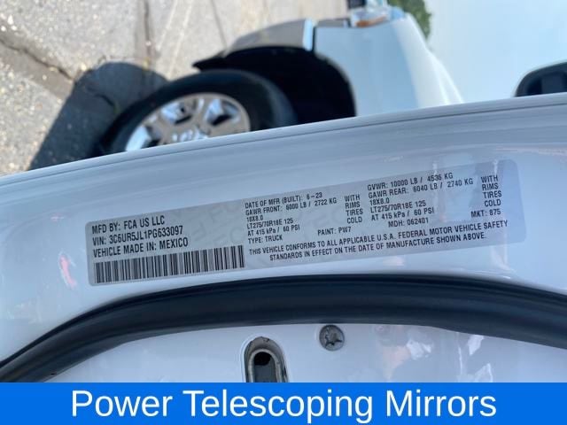 2nd Row In Floor Storage Bins, 4G LTE Wi-Fi Hot Spot, 8.4" Touchscreen Display, Apple CarPlay, Auto Power-Folding Mirrors, Big Horn IP Badge, Black Exterior Mirrors, Bluetooth Handsfree Phone & Audio, Connectivity - US/Canada, Dual Glove Boxes, Exterior Mirrors Courtesy Lamps, Exterior Mirrors w/Heating Element, Exterior Mirrors w/Supplemental Signals, Foam Bottle Insert (Door Trim Panel), Footwell Courtesy Lamp, For Details, Visit DriveUconnect.com, For More Info, Call 800-643-2112, Forward & Reverse Utility Lights, Front Fog Lamps, Global Telematics Box Module (TBM), Glove Box Lamp, Google Android Auto, GPS Antenna Input, Integrated Center Stack Radio, Integrated Voice Command w/Bluetooth, Leather Wrapped Steering Wheel, Level 1 Equipment Group, Locking Lower Glove Box, Mirror Running Lights, ParkView Rear Back-Up Camera, Power Adjust Mirrors, Power Adjustable Convex Aux Mirrors, Power Heated Fold Telescope Mirrors, Power Telescoping Mirrors, Premium Cloth 40/20/40 Bench Seat, Quick Order Package 2HZ Big Horn, Radio: Uconnect 5 W w/8.4" Display, Rear Dome w/On/Off Switch Lamp, Selectable Tire Fill Alert, SiriusXM Radio Service, SiriusXM Satellite Radio, Speed control, Steering Wheel Mounted Audio Controls, 2 Way Rear Headrest Seat, 3.73 Axle Ratio, 4 Way Front Headrests, 4-Wheel Disc Brakes, 40/20/40 Split Bench Seat, 6 Speakers, ABS brakes, Active Noise Control System, Air Conditioning, Alloy wheels, Auto-dimming Rear-View mirror, Brake assist, Bumpers: chrome, Center Hub, Center Stack Storage Drawer, Chrome Flat Cab-Length Side Steps, Cloth 40/20/40 Bench Seat, Compass, Delay-off headlights, Driver door bin, Dual front impact airbags, Dual front side impact airbags, Electronic Stability Control, Electronically Controlled Throttle, Emergency communication system: SiriusXM Guardian, Front anti-roll bar, Front Armrest w/Cupholders, Front Center Armrest w/Storage, Front Center Seat Cushion Storage, Front License Plate Bracket, Front reading lights, Front Seat Back Map Pockets, Fully automatic headlights, Heated door mirrors, Illuminated entry, Low tire pressure warning, Manual Adjust 4-Way Driver Seat, Manual Adjust 4-Way Front Passenger Seat, Manufacturer's Statement of Origin, Occupant sensing airbag, Outside temperature display, Overhead airbag, Overhead console, Panic alarm, Passenger door bin, Passenger vanity mirror, Power 2-Way Driver Lumbar Adjust, Power Adjust 8-Way Driver Seat, Power door mirrors, Power steering, Power windows, Radio data system, Radio: Uconnect 3 w/5" Display, Rear 60/40 Folding Seat, Rear anti-roll bar, Rear Folding Seat, Rear seat center armrest, Rear step bumper, Remote keyless entry, Storage Tray, Tachometer, Tilt steering wheel, Tip Start, Tow Hooks, Traction control, Trip computer, Turn signal indicator mirrors, Variably intermittent wipers, Voltmeter, Wheels: 18" x 8.0" Polished Aluminum, One Owner Clean Carfax, 6.7L CUMMINS TURBO DIESEL ENGINE, 2nd Row In Floor Storage Bins, 4G LTE Wi-Fi Hot Spot, 8.4" Touchscreen Display, Apple CarPlay, Auto Power-Folding Mirrors, Big Horn IP Badge, Black Exterior Mirrors, Bluetooth Handsfree Phone & Audio, Connectivity - US/Canada, Dual Glove Boxes, Exterior Mirrors Courtesy Lamps, Exterior Mirro